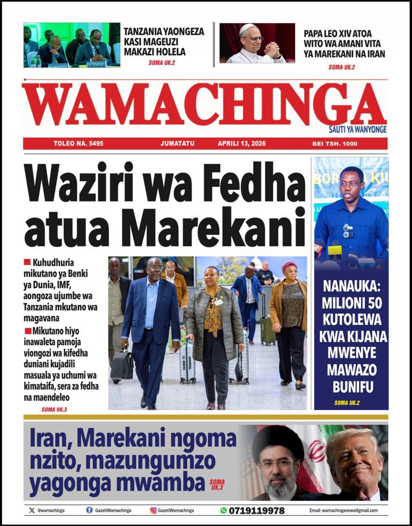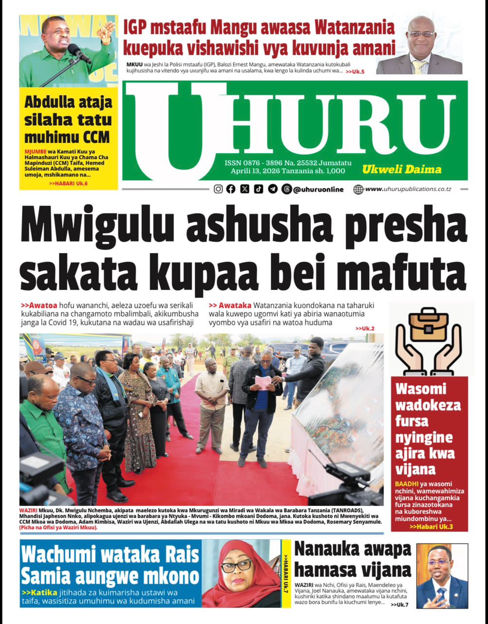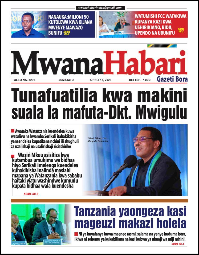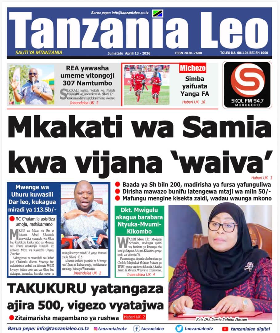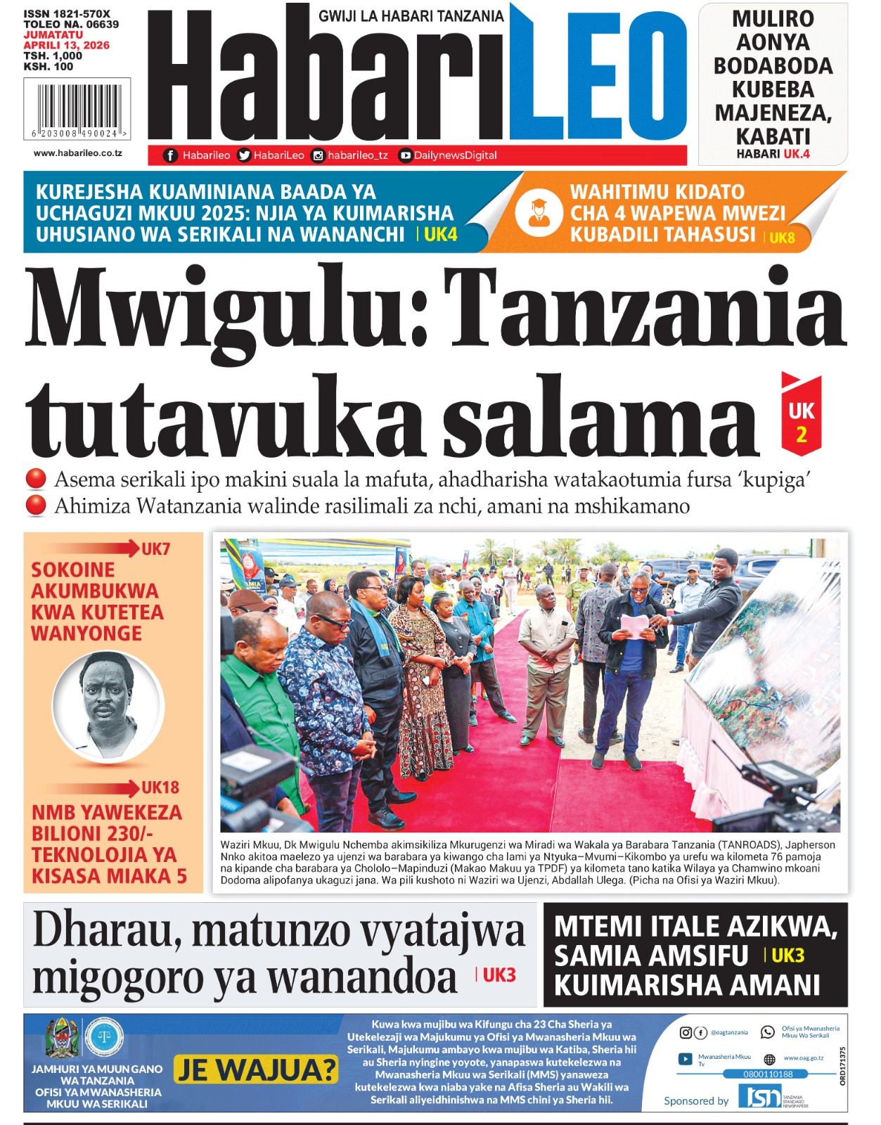 NyumbaniMAGAZETI VICHWA VYA HABARI MAGAZETI YA LEO JUMATATU APRILI 13,2026 MWIGULU: TUTAVUKA SALAMA byMagina Media -Aprili 12, 2026 0